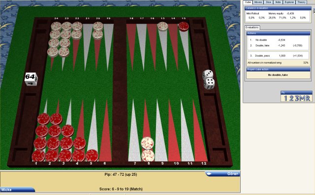 Kände mig tvungen att titta på situationen ovan tillsammans med Snowie den allsmäktige för att se om jag förtjänade min "Hard luck" pga felaktigt spel. Snowie säger dock att Görans kub är en klar blunder, liksom taget av min påföljande fyrkub. Ok, jag spelade rätt, i teorin. I praktiken var ju Görans spel det klart bästa. Ytterligare ett exempel på att teori och praktik inte alltid går hand i hand i backgammon. Nej, ett jävla skitspel är vad det är. Åtminstone ibland när man förlorar. Men som sagt, jag är inte bitter