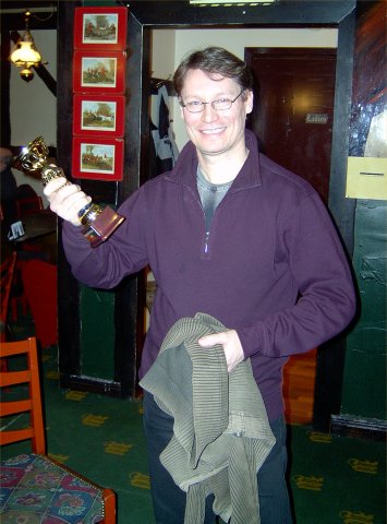 Helt oväntat delar då Göran ut en käftsmäll i form av två treor. Hallå! Vad är det som händer? Tre dubblar på de fyra sista slagen? Det är ju jag som ska vinna det här! Jag tar inte ledningen med 10-9 utan istället står det 6-13. Åh fan, det är inte meningen att jag ska vinna ändå. Jag lyckas hålla jämna steg till 11-18 och crawford, men närmaren än 14-18 kommer jag aldrig. Bara att lämna över cashen och plåta en glatt poserande Göran med "min" blänkande buckla i händerna. Grattis Göran, som med denna seger är ensam spelare att ha vunnit Uppsalamästerskapet flest gånger (fyra).